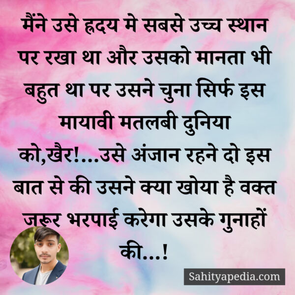 मैंने उसे ह्रदय मे सबसे उच्च स्थान पर रखा था और उसको मानता भी बहुत था पर उसने चुना सिर्फ इस मायावी मतलबी दुनिया को,खैर!…उसे अंजान रहने दो इस बात से की उसने क्या खोया है वक्त जरूर भरपाई करेगा उसके गुनाहों की…!