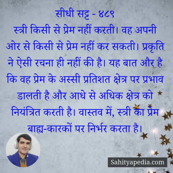 स्त्री किसी से प्रेम नहीं करती। वह अपनी ओर से किसी से प्रेम नहीं कर सकती। प्रकृति ने ऐसी रचना ही नहीं की है। यह बात और है कि वह प्रेम के अस्सी प्रतिशत क्षेत्र पर प्रभाव डालती है और आधे से अधिक क्षेत्र को नियंत्रित करती है। वास्तव में, स्त्री का प्रेम बाह्य-कारकों पर निर्भर करता है।