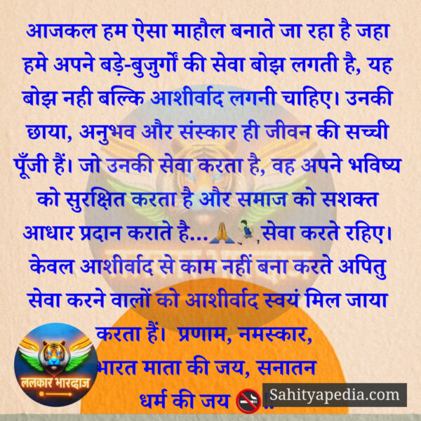 आजकल हम ऐसा माहौल बनाते जा रहा है जहा हमे अपने बड़े-बुजुर्गों की सेवा बोझ लगती है, यह बोझ नही बल्कि आशीर्वाद लगनी चाहिए। उनकी छाया, अनुभव और संस्कार ही जीवन की सच्ची पूँजी हैं। जो उनकी सेवा करता है, वह अपने भविष्य को सुरक्षित करता है और समाज को सशक्त आधार प्रदान कराते है…🙏🏃🏻♂️सेवा करते रहिए। केवल आशीर्वाद से काम नहीं बना करते अपितु सेवा करने वालों को आशीर्वाद स्वयं मिल जाया करता हैं। प्रणाम, नमस्कार,