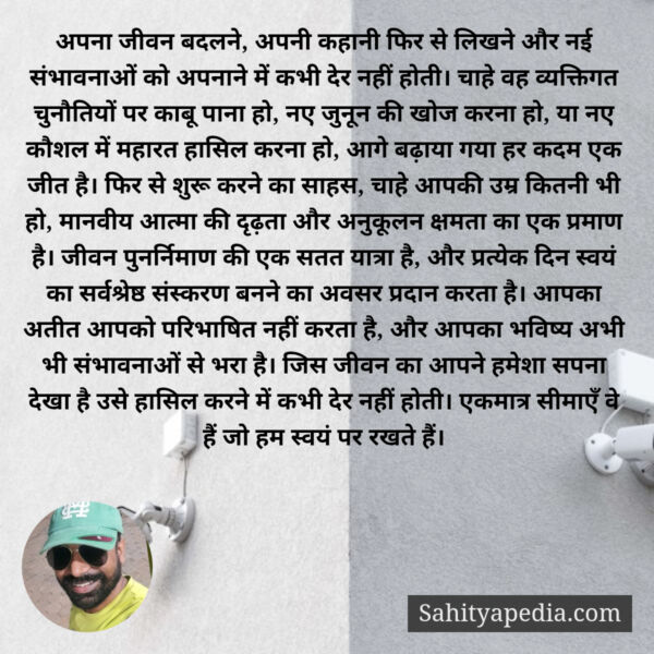 अपना जीवन बदलने, अपनी कहानी फिर से लिखने और नई संभावनाओं को अपनाने में कभी देर नहीं होती। चाहे वह व्यक्तिगत चुनौतियों पर काबू पाना हो, नए जुनून की खोज करना हो, या नए कौशल में महारत हासिल करना हो, आगे बढ़ाया गया हर कदम एक जीत है। फिर से शुरू करने का साहस, चाहे आपकी उम्र कितनी भी हो, मानवीय आत्मा की दृढ़ता और अनुकूलन क्षमता का एक प्रमाण है। जीवन पुनर्निमाण की एक सतत यात्रा है, और प्रत्येक दिन स्वयं का सर्वश्रेष्ठ संस्करण बनने का अवसर प्रदान करता है। आपका अतीत आपको परिभाषित नहीं करता है, और आपका भविष्य अभी भी संभावनाओं से भरा है। जिस जीवन का आपने हमेशा सपना देखा है उसे हासिल करने में कभी देर नहीं होती। एकमात्र सीमाएँ वे हैं जो हम स्वयं पर रखते हैं।