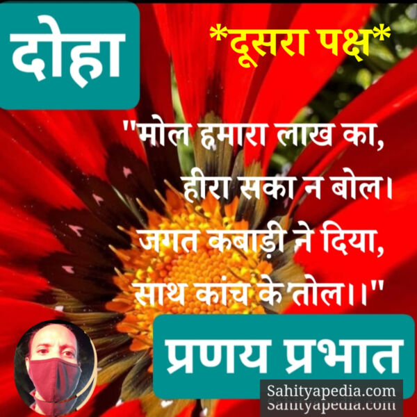 इसी तरह के चिंतन से प्रेरित एक नवाचारी और प्रयोगधर्मी रचनाकार के रूप में मैने सामयिक संदर्भों में तमाम दोहों के दूसरे पक्ष को रेखांकित करने का प्रयास पहले भी किया है, आज भी कर रहा हूँ। इस मर्म के साथ कि बदलाव एक अहम प्रक्रिया है, जिससे अछूता कुछ नहीं। अन्य कई दोहों की तरह उक्त दोहे का दूसरा पक्ष आज भी प्रस्तुत कर रहा हूं। बदली हुई सारी परिस्थितियों और परिदृश्यों के अनुसार। सुधिजन पुराने ब नए दोहों के बीच का द्वंद्व न मानें, बल्कि इस प्रयोग को देशकाल और वातावरण में बदलाव की दृष्टि से देखें। इस तर्क के आधार पर कि “साहित्य समाज का दर्पण होता है।” दृश्य व प्रतिबिंब बदलते रहते हैं और दर्पण उन्हें प्रतिबिंबित करता रहता है।