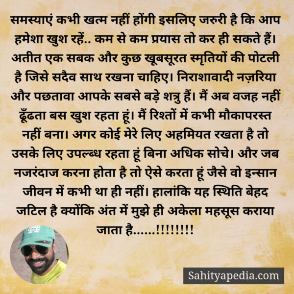 समस्याएं कभी खत्म नहीं होंगी इसलिए जरुरी है कि आप हमेशा खुश रहें.. कम से कम प्रयास तो कर ही सकते हैं। अतीत एक सबक और कुछ खूबसूरत स्मृतियों की पोटली है जिसे सदैव साथ रखना चाहिए। निराशावादी नज़रिया और पछतावा आपके सबसे बडे़ शत्रु हैं। मैं अब वजह नहीं ढूँढता बस खुश रहता हूं। मैं रिश्तों में कभी मौकापरस्त नहीं बना। अगर कोई मेरे लिए अहमियत रखता है तो उसके लिए उपल्ब्ध रहता हूं बिना अधिक सोचे। और जब नजरंदाज करना होता है तो ऐसे करता हूं जैसे वो इन्सान जीवन में कभी था ही नहीं। हालांकि यह स्थिति बेहद जटिल है क्योंकि अंत में मुझे ही अकेला महसूस कराया जाता है……!!!!!!!!