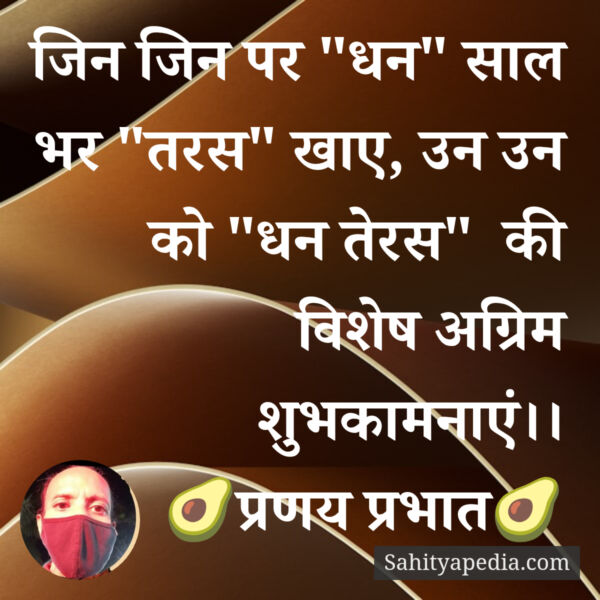 जिन जिन पर “धन” साल भर “तरस” खाए, उन उन को “धन तेरस” की विशेष अग्रिम शुभकामनाएं।।