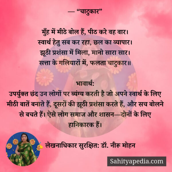 उपर्युक्त छंद उन लोगों पर व्यंग्य करती है जो अपने स्वार्थ के लिए मीठी बातें बनाते हैं, दूसरों की झूठी प्रशंसा करते हैं, और सच बोलने से बचते हैं। ऐसे लोग समाज और शासन—दोनों के लिए हानिकारक हैं।
