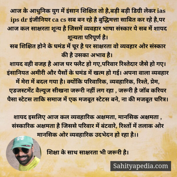 आज के आधुनिक युग में इंसान शिक्षित तो है,बड़ी बड़ी डिग्री लेकर ias ips dr इंजीनियर ca cs सब बन रहे है बुद्धिमत्ता साबित कर रहे है,पर आज कल साक्षरता शून्य है जिसमें व्यवहार भाषा संस्कार ये सब में शायद शून्यता परिपूर्ण है।