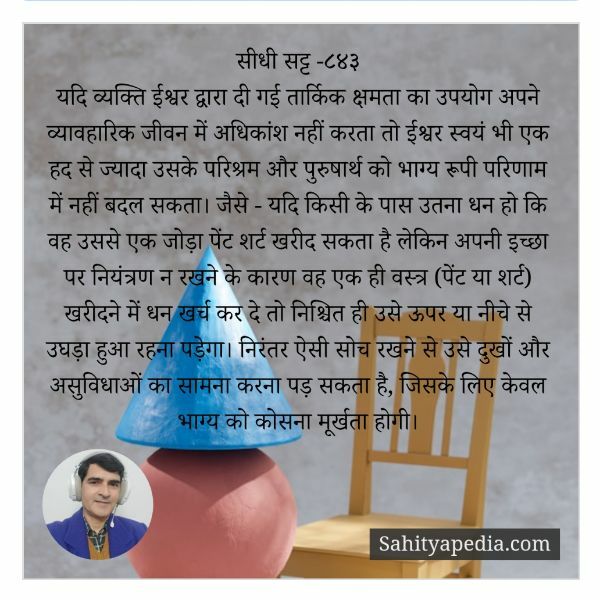 यदि व्यक्ति ईश्वर द्वारा दी गई तार्किक क्षमता का उपयोग अपने व्यावहारिक जीवन में अधिकांश नहीं करता तो ईश्वर स्वयं भी एक हद से ज्यादा उसके परिश्रम और पुरुषार्थ को भाग्य रूपी परिणाम में नहीं बदल सकता। जैसे – यदि किसी के पास उतना धन हो कि वह उससे एक जोड़ा पेंट शर्ट खरीद सकता है लेकिन अपनी इच्छा पर नियंत्रण न रखने के कारण वह एक ही वस्त्र (पेंट या शर्ट) खरीदने में धन खर्च कर दे तो निश्चित ही उसे ऊपर या नीचे से उघड़ा हुआ रहना पड़ेगा। निरंतर ऐसी सोच रखने से उसे दुखों और असुविधाओं का सामना करना पड़ सकता है, जिसके लिए केवल भाग्य को कोसना मूर्खता होगी।