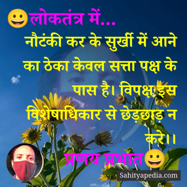 नौटंकी कर के सुर्खी में आने का ठेका केवल सत्ता पक्ष के पास है। विपक्ष इस विशेषाधिकार से छेड़छाड़ न करे।।