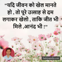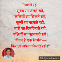 लिखेश्वर (likheshwar) Tag: Quote Writer 2 posts Sort by: Latest Likes Views List Grid लिखेश्वर (likheshwar) 31 May 2025 · 1 min read "चलते रहो, "चलते रहो, सूरज सा जलते रहो, कलियों सा खिलते रहो, फूलों सा महकते रहो, तारों सा टिमटिमाते रहो, पक्षियों सा चहचहाते रहो। जीवन है एक रंगमंच — किरदार अपना निभाते... Quote Writer 1 69 Share लिखेश्वर (likheshwar) 4 Feb 2025 · 1 min read "यदि जीवन को खेल मानते हो , तो पूरे उत्साह से दम लगाकर खेलो "यदि जीवन को खेल मानते हो , तो पूरे उत्साह से दम लगाकर खेलो , ताकि जीत भी मिले ,आनंद भी !" Quote Writer 1 181 Share