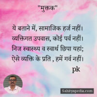 पंकज कर्ण 286 posts Sort by: Latest Likes Views List Grid पंकज कर्ण 10 Oct 2025 · 1 min read मुक्तक मुक्तक देखो,देखो; नेताओं का नकली प्यार। सिंहासन पाने को आतुर, नेता हजार। आगे-पीछे हो चले, कमलपुष्प तोड़ने; पर, औंधे मुंह गिरते हैं; सब बारंबार। pk Quote Writer 2 403 Share पंकज कर्ण 6 Oct 2025 · 1 min read बेरोजगारी दूर करने के 4 उपाय: बेरोजगारी दूर करने के 4 उपाय: _________________________ 1. कामचोर की नौकरी छीन लो। 2. ड्यूटी से फरार रहने वाले को बर्खास्त कर दो। 3. बीमारी का बहाना बनाने वाले को... Quote Writer 137 Share पंकज कर्ण 6 Oct 2025 · 1 min read 'अच्छी बातें' किसी भी जाति व धर्म का हो, 'अच्छी बातें' किसी भी जाति व धर्म का हो, स्वीकार्य होना चाहिए। 'सच्ची बातें' किसी भी जाति व धर्म का हो, स्वीकार्य होना चाहिए। किंतु कथित बात बताने वाले का... Quote Writer 1 90 Share पंकज कर्ण 30 Sep 2025 · 1 min read मुद्दे की बात 'मुद्दे की बात' मुद्दा मोदी नहीं, मुद्दा योगी नहीं; मुद्दा मोदी हारे या जीते,ये नहीं; मुद्दा ये नहीं; कि विकल्प योगी बने, मुद्दा तो है, राष्ट्र सुरक्षित हाथ में रहे;... Hindi · कविता 3 371 Share पंकज कर्ण 29 Sep 2025 · 1 min read पूजा - पाठ बन रहा, दिखावा; पूजा - पाठ बन रहा, दिखावा; लफंगे भी बन रहे अब, बाबा; भक्तों में दिखे, तस्वीरी जज्बा; विरक्त चाहे,भगवान पे कब्जा। '''''''''''''''''''''''''''''''''''''''''''''''''''''''''''''''''''''''''''''''''''''' pk Quote Writer 2 364 Share पंकज कर्ण 22 Sep 2025 · 1 min read आरोप प्रचंड "आरोप प्रचंड" हाथ से लेकर सदा, रुपया चंद; पक्ष में गाती तब , राठौर उदंड; कोर्ट ने माना जो,आरोप प्रचंड; तब बुद्धि पड़ गई, उसकी मंद। बड़ी चिंता थी, यूपी-बिहार... Hindi · कविता 3 779 Share पंकज कर्ण 13 Sep 2025 · 1 min read मिले जिसे, माड़ नै; मिले जिसे, माड़ नै; खोजे, वो भी ताड़ी; लहंगा मिले, महंगा; पहने न नारी, साड़ी; जो पहने,लगे प्यारी; कहलाये, देशी नारी। pk Quote Writer 96 Share पंकज कर्ण 7 Sep 2025 · 1 min read मुक्तक मुक्तक इंसान क्यों जलता, इंसान से। जलन तो हमने देखी, शान से। जब सिर्फ हाथों की जलन थी; लगा था, अब तो गए जान से। pk Quote Writer 574 Share पंकज कर्ण 7 Sep 2025 · 1 min read मुक्तक मुक्तक इंसान क्यों जलता , इंसान से। जलन तो हमने देखी, शान से। जब सिर्फ हाथों की जलन थी; लगा था, अब तो गए जान से। pk Quote Writer 111 Share पंकज कर्ण 2 Sep 2025 · 1 min read 'भीरूभाई' 'भीरूभाई' _________ भटके भीरू,भाड़े के भीड़ संग; हिंद की जनता हुईं, उससे तंग। वह लगे सबको,देशी तैमूर लंग; नाम पप्पू, नहीं उसमें कोई ढंग। भक्त कहे युवा, रक्त में कई... Hindi · कविता 2 695 Share पंकज कर्ण 24 Aug 2025 · 1 min read भीड़ चोर भीड़ चोर ******** एक विषय गंभीर, राह निकले नकली पीर, चलाए अंधेरे में तीर, जुटाए, भाड़े की भीड़, बहता उसके कारण गरीबों का नीर। हर देशी बनो, वीर; वरना, हर... Quote Writer 102 Share पंकज कर्ण 24 Aug 2025 · 1 min read भीड़ चोर भीड़ चोर ******** एक विषय गंभीर, राह निकले नकली पीर, चलाए अंधेरे में तीर, जुटाए, भाड़े की भीड़, बहता उसके कारण गरीबों का नीर। हर देशी बनो, वीर; वरना, हर... Hindi 1 237 Share पंकज कर्ण 4 Aug 2025 · 1 min read मुंह चमकी मुंह चमकी बेच के आपन इज्ज़त आबरू; बताबऽ केकर लेल 