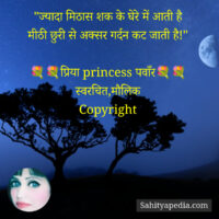 Priya princess panwar Tag: Quote Writer 22 posts Sort by: Latest Likes Views List Grid Priya princess panwar 22 Mar 2025 · 1 min read लिखा जब दिल का मैंने... लिखा जब दिल का मैंने... हर अल्फाज दर्द ही बोल रहा था। लिखा ऐसा फ़साना मैंने... जो दुनियाई सच खोल रहा था। क्या कहूँ मैं अ दोस्त ?... जो कहा... Quote Writer 1 146 Share Priya princess panwar 3 Aug 2024 · 1 min read दिल पहले शीशा था,अब पत्थर बना लिया। दिल पहले शीशा था,अब पत्थर बना लिया। जब कोई न अपना,तो खुद को ही सिकन्दर बना लिया। रहती खुद में मस्त,खुद को मस्त-कलन्दर बना लिया। प्रिया प्रिंसेस पवाँर स्वरचित,मौलिक Quote Writer 1 348 Share Priya princess panwar 10 Jul 2024 · 1 min read बार-बार लिखा, बार-बार लिखा, बार-बार मिटाया। ख़ुशी अल्फाज ने हमें..., कितना भरमाया...। प्रिया प्रिंसेस पवाँर स्वरचित,मौलिक द्वारका मोड़,नई दिल्ली-78 Quote Writer 2 280 Share Priya princess panwar 30 Mar 2024 · 1 min read जीवन के उलझे तार न सुलझाता कोई, जीवन के उलझे तार न सुलझाता कोई, न कोई बुनता है। उसकी झूठी ख़ामोशी भी है बोलती, मेरे सच्चे अल्फ़ाज़ भी न कोई सुनता है। प्रिया प्रिंसेस पवाँर स्वरचित,मौलिक नियर... Quote Writer 2 2 391 Share Priya princess panwar 30 Mar 2024 · 1 min read मेरी मजबूरी को बेवफाई का नाम न दे, मेरी मजबूरी को बेवफाई का नाम न दे, इस बेदर्द दुनिया में अक्सर... प्यार ही मजबूर हुआ करता है। प्रिया प्रिंसेस पवाँर स्वरचित,मौलिक द्वारका मोड़,नई दिल्ली-78 Quote Writer 3 803 Share Priya princess panwar 25 Mar 2024 · 1 min read अगर हो दिल में प्रीत तो, अगर हो दिल में प्रीत तो, भगवान मिल जाए। जैसे मीरा भई श्याम, श्याम मीरा कहलाएं। प्रिया प्रिंसेस पवाँर स्वरचित,मौलिक द्वारका मोड़,नई दिल्ली-78 Quote Writer 2 1 561 Share Priya princess panwar 20 Mar 2024 · 1 min read दूसरों की लड़ाई में ज्ञान देना बहुत आसान है। दूसरों की लड़ाई में ज्ञान देना बहुत आसान है। बस अपनी ही बड़ाई,.. बस अपना ही मान है। पाप करते-करते हुआ पापी,... बचा कहाँ इंसान है। Priya princess panwar Selfmade... Quote Writer 3 249 Share Priya princess panwar 18 Mar 2024 · 1 min read गीत लिखूं...संगीत लिखूँ। गीत लिखूं...संगीत लिखूँ। गर तुम साथ दो मेरा..., तो पहली प्रीत लिखूँ। प्रिया प्रिंसेस पवाँर स्वरचित,मौलिक Quote Writer 3 324 Share Priya princess panwar 18 Mar 2024 · 1 min read खुद के हाथ में पत्थर,दिल शीशे की दीवार है। खुद के हाथ में पत्थर,दिल शीशे की दीवार है। जिसका अलग शब्द,अलग व्यवहार है। प्रिया प्रिंसेस पवाँर स्वरचित,मौलिक द्वारका मोड़,नई दिल्ली-78 Quote Writer 4 229 Share Priya princess panwar 14 Mar 2024 · 1 min read हर कदम प्यासा रहा..., हर कदम प्यासा रहा..., रहा प्यासा सफर सारा...। न जाने कैसी तकदीर जिंदगी की...? लिखा किसने भाग्य हमारा...? प्रिया प्रिंसेस पवाँर स्वरचित,मौलिक द्वारका मोड़,नई दिल्ली-78 Quote Writer 3 348 Share Priya princess panwar 14 Mar 2024 · 1 min read आजकल रिश्तें और मक्कारी एक ही नाम है। आजकल रिश्तें और मक्कारी एक ही नाम है। प्रिया प्रिंसेस पवाँर स्वरचित Quote Writer 3 370 Share Priya princess panwar 13 Mar 2024 · 1 min read मैं अपने सारे फ्रेंड्स सर्कल से कहना चाहूँगी..., मैं अपने सारे फ्रेंड्स सर्कल से कहना चाहूँगी..., जब भी कोई प्रॉब्लम हो। जब भी कोई तकलीफ हो। जब भी क