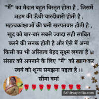 Seema Verma 46 posts Sort by: Latest Likes Views List Grid Seema Verma 20 Mar 2024 · 1 min read सच्चाई *कविता - सच्चाई जो ना बताई जाए वह सच्चाई है जो ना बनाई जाए वह सच्चाई है जो न छुपाई जाए वह सच्चाई है जो ना मिटाई जाए वह सच्चाई... "सत्य की खोज" – काव्य प्रतियोगिता 5 2 207 Share Seema Verma 27 Jan 2024 · 1 min read एक गरिमामय व्यक्तित्व के लिए उस गरिमामय व्यक्तित्व के लिए जिस की झांकी , एक दूसरी गरिमामई दृष्टि में सजी हुई मिली थी । "" समय का स्पर्श या काल की घटना आप से मेरा... Poetry Writing Challenge-2 265 Share Seema Verma 27 Jan 2024 · 1 min read ( सब कुछ बदलने की चाह में जब कुछ भी बदला ना जा सके , तब हाला ( सब कुछ बदलने की चाह में जब कुछ भी बदला ना जा सके , तब हालात शायद ऐसे होजाते हैं ) दिल में जाने क्यों हुई बेचैनी है जैसे... Poetry Writing Challenge-2 292 Share Seema Verma 27 Jan 2024 · 1 min read मेरी कहानी एक कहानी मेरी जन्मी एक फसाना तेरा जन्मा तेरे आँसू , मेरे आँसू एक ज़माना फिर से गुज़रा तू जो बोले , तू जो चाहे मेरा "अपना आप " वो... Poetry Writing Challenge-2 271 Share Seema Verma 27 Jan 2024 · 1 min read इन्सानी रिश्ते इंसानी रिश्ते इंसान रिश्ते क्यों बनाता है ? एक दूसरे का साथ क्यों निभाता है ? सिर्फ हँसने या रोने के लिए ? कुछ पाने या कुछ खोने केलिए ?... Poetry Writing Challenge-2 358 Share Seema Verma 27 Jan 2024 · 1 min read एक गरीबी एक गरीबी बहुत दिनों में मिली मुझे वो तब और अब में कुछ अंतर था पहले उसको देखा मैंने फुटपाथ पर पड़ी हुई थी मानो कोई लाश के जैसे बिना... Poetry Writing Challenge-2 225 Share Seema Verma 27 Jan 2024 · 1 min read तन की शादी मन की शादी तन की शादी , मन की शादी दो अलग - अलग सरहदें दो अलग - अलग ज़मीनें जब जीवन के नक्शे पे अपनी लकीरें मिटाकर " एक हों " तो... Poetry Writing Challenge-2 343 Share Seema Verma 27 Jan 2024 · 1 min read मेरी तृष्णा सुन रे अबोले , बेनाम रिश्ते -- आ , अपनी बतियों ( बातों ) की सुई ला और सिल दे मेरी तन्हाइयों की फटी चूनर सुन रे अबूझे , अपठित... Poetry Writing Challenge-2 291 Share Seema Verma 27 Jan 2024 · 1 min read रिश्तों की भूख रिश्तों की भूख एक अहसास की भूख एक जज्बात की भूख लोग कहते हैं कि मुझमें है ख्यालात की भूख प्यार की भूख दर्द की भूख आँसूओं की भूख लोग... Poetry Writing Challenge-2 437 Share Seema Verma 27 Jan 2024 · 1 min read मंच पर मेरी आज की प्रस्तुति मंच पर मेरी आज की प्रस्तुति इक महकता ख्वाब हूंँ या फ़िर माहताब हूंँ मैं गुलों का रंग या फ़िर आफताब हूंँ आसमां हूंँ या फ़िर इक पूरी जमीन हूँ.... Poetry Writing Challenge-2 222 Share Seema Verma 23 Jan 2024 · 1 min read होली के पावन पर्व पर पुलवामा शहीदों और पल - पल शहीद होते अन् होली के पावन पर्व पर पुलवामा शहीदों और पल - पल शहीद होते अन्य सैंकड़ों जवानों को समर्पित मेरी कुछ पंक्तियाँ :-- तुम माथ गुलाल लगाते हो मैं माथ देश... Poetry Writing Challenge-2 1 216 Share Seema Verma 24 Dec 2023 · 1 min read *आधुनिकता के नाम पर अपनेआप को दुनिया के समक्ष नंगा दिखाना भा *आधुनिकता के नाम पर अपनेआप को दुनिया के समक्ष नंगा दिखाना भारतीय संस्कृति में जुड़ी एक नई परंपरा है शायद.......अफसोसजनक बात ये है कि माता-पिता व समस्त परिवार स्वयं इस... 258 Share Seema Verma 14 May 2023 · 1 min read दायरों में बँधा जीवन शायद ख